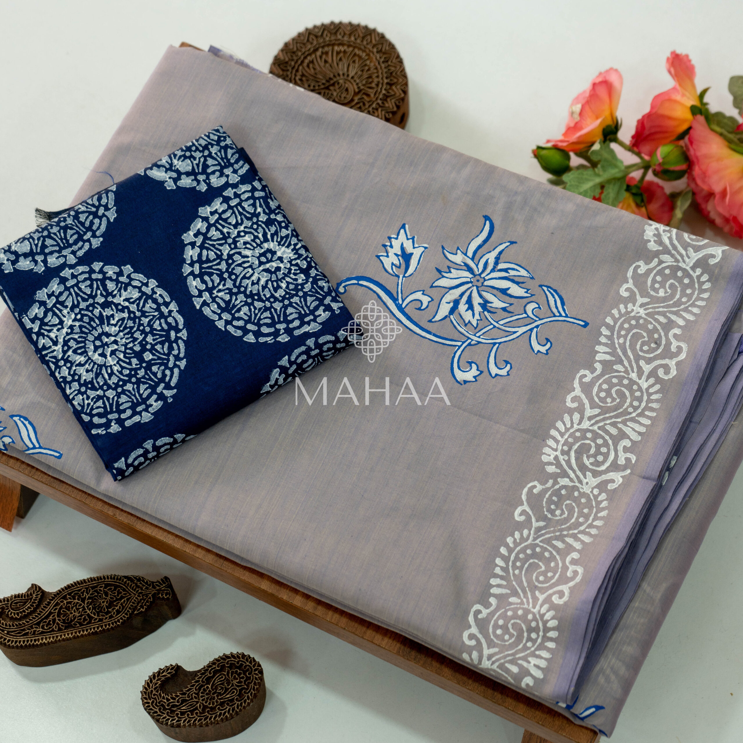 Blended South Cotton Printed sarees with contrasting blouse