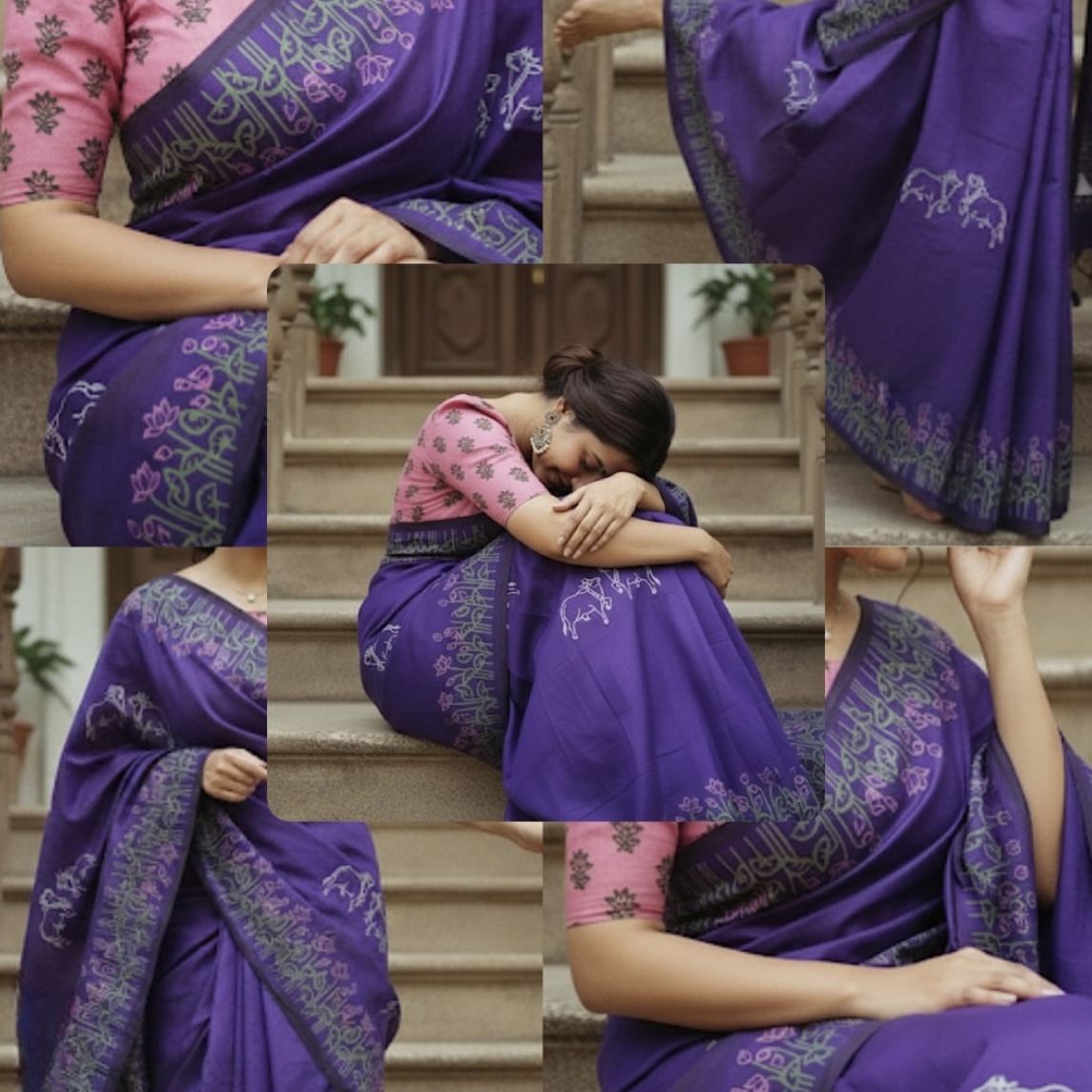 Blended South Cotton Printed sarees with contrasting blouse
