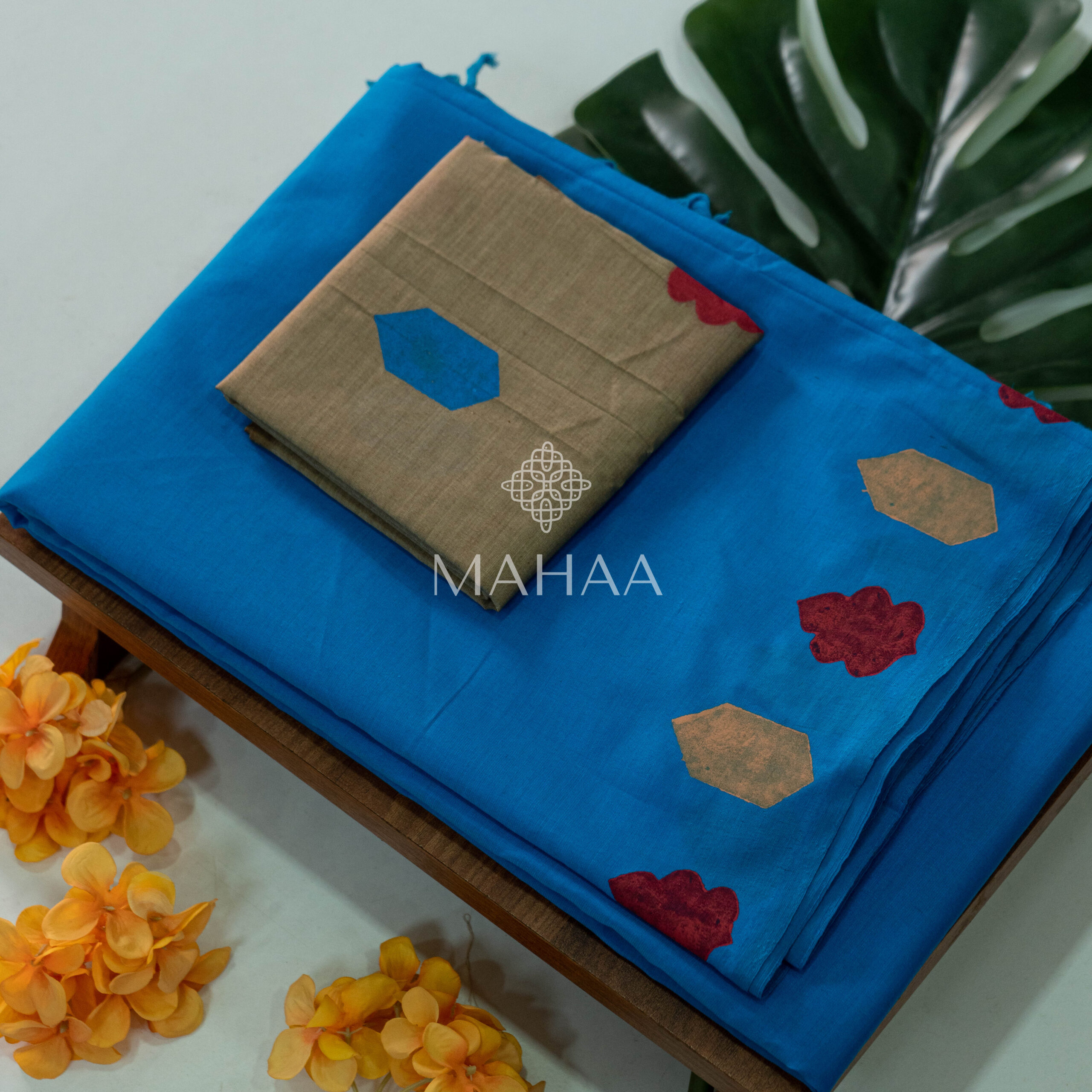Blended South Cotton Printed sarees with contrasting blouse