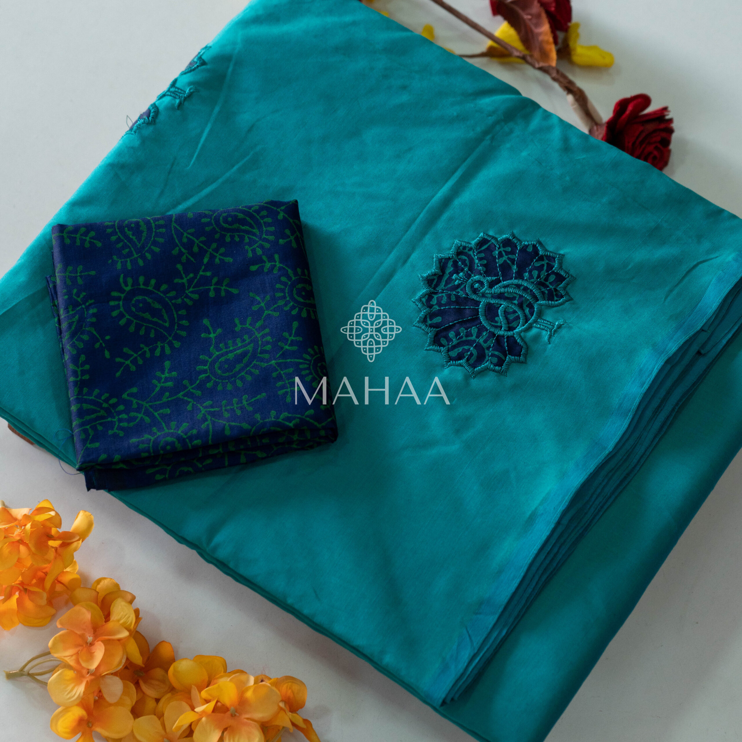 Blended South Cotton with applique work saree with contrasting blouse